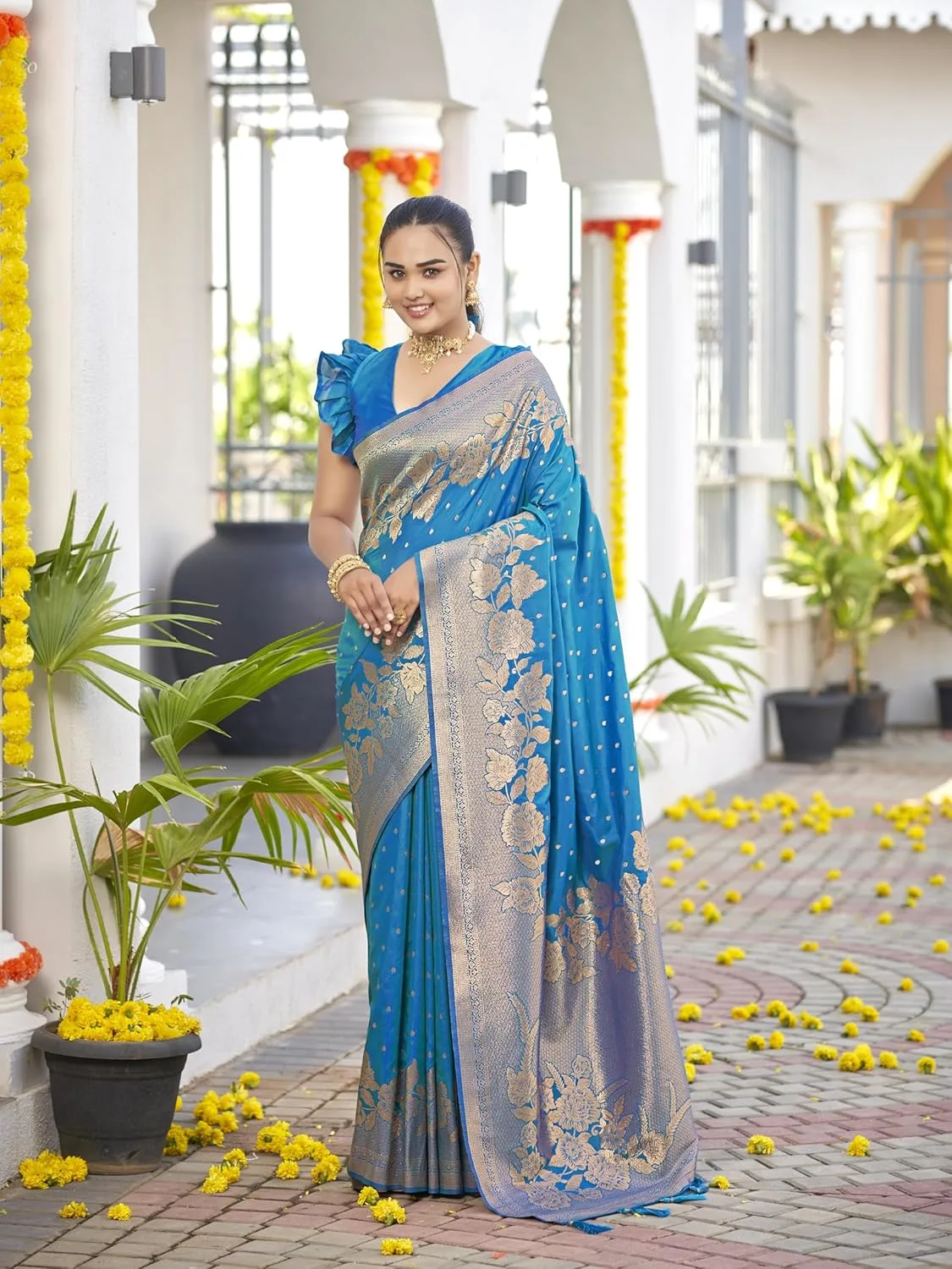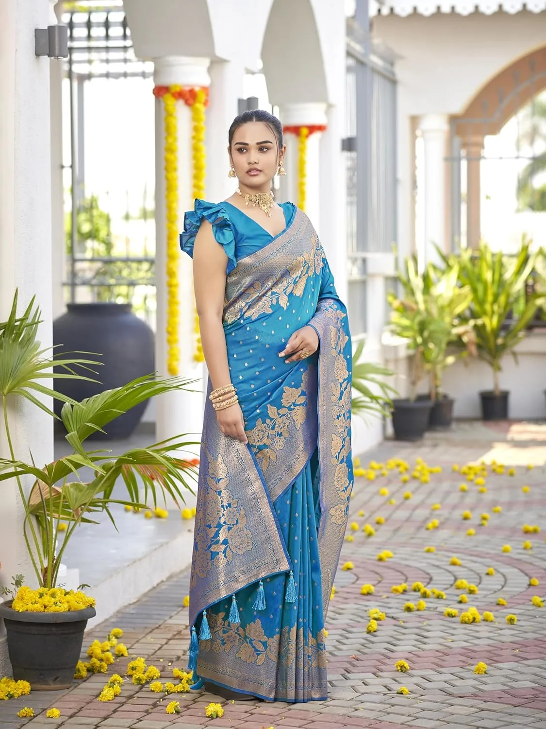 Elevate your ethnic style with this exquisite Blue Banarasi Silk Saree. Designed with a luxurious jacquard weave, this saree is perfect for festivals, parties, and weddings. The saree comes with a matching unstitched blouse piece, giving you the freedom to customize your look.