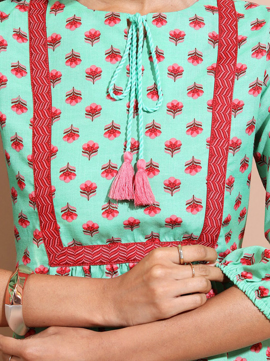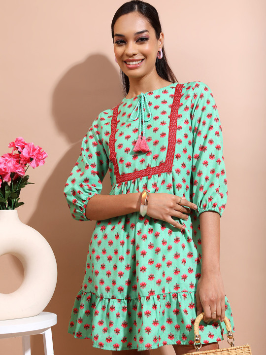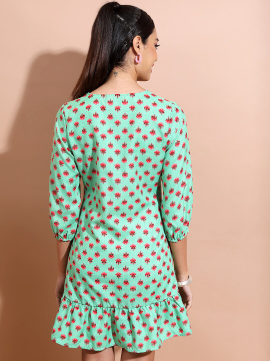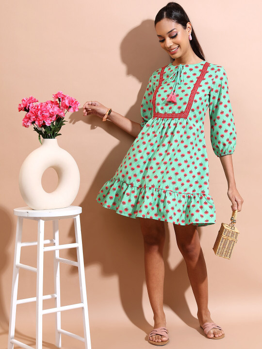 Green & Red Floral Print A-Line Dress