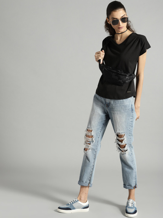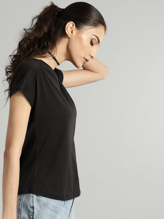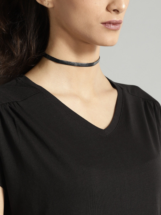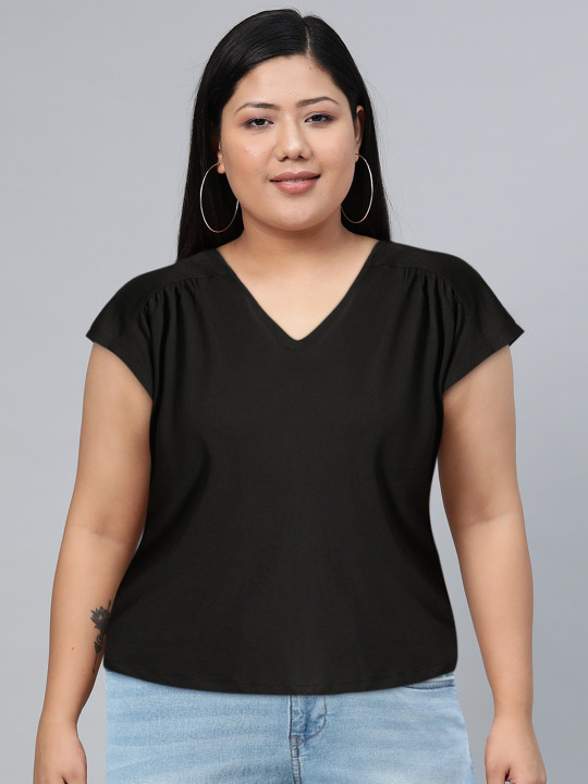 This versatile black V-neck top is a timeless addition to your wardrobe. Pair it with dark wash jeans and loafers for a chic lunch outing or casual day look.