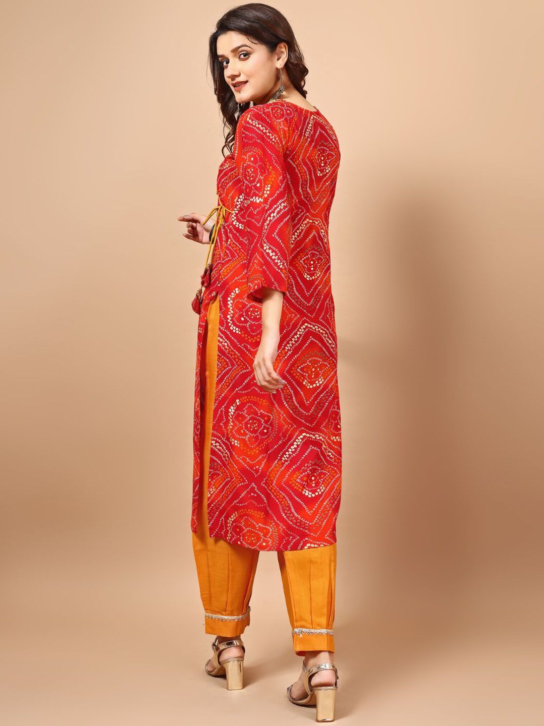 Red Bandhani V-neck Kurta — Knee Length, Straight Fit