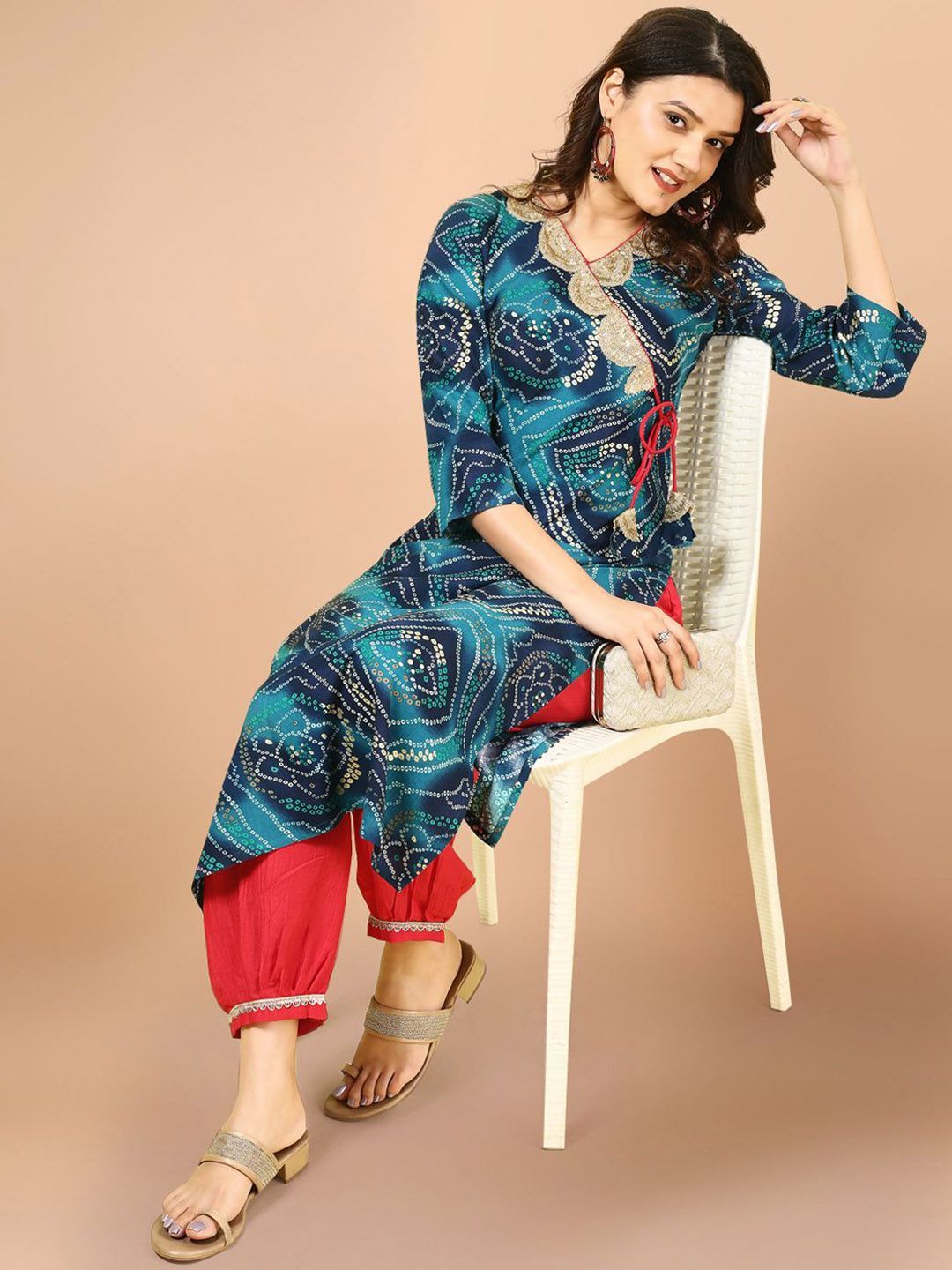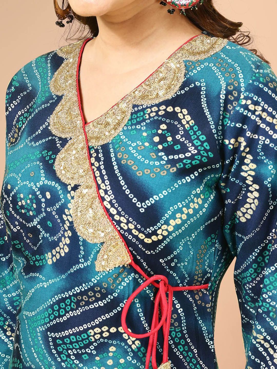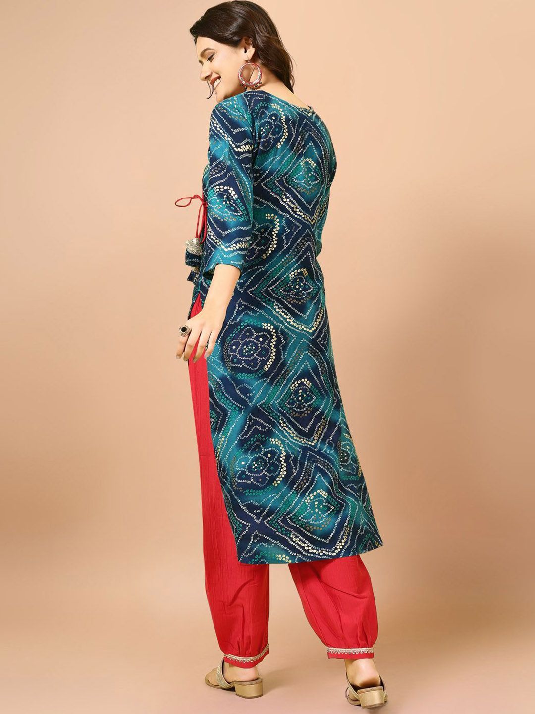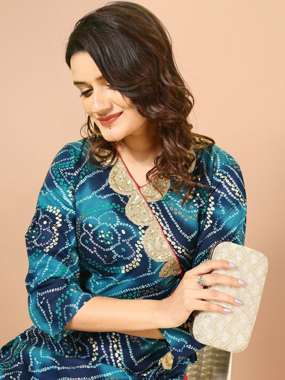 Pair this kurta with neutral leggings or straight palazzos and minimal jewelry to let the bandhani print and sequin work shine. Add mojris or kolhapuri sandals for a complete ethnic look.