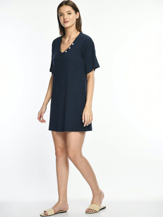Solid • V-neck • Short regular sleeves • Mini length • Straight hem • Ribbed texture